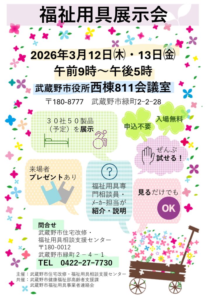 福祉用具展示会を開催します! 2026 2/20 他機関情報 2026年2月20日 令和7年度武蔵野市福祉用具展示会を開催いたします。詳細につきましては、チラシをご確認ください 他機関情報 3/10 介護の仕事に役立つ外国人のための交流会 関連記事 3/10 介護の仕事に役立つ外国人のための交流会 2026年1月21日 2/10 『ちがいをこえて、共に生きる』講演会のご案内 2026年1月21日 【1/22 18:30〜】地域包括ケア研究会 公開講座のお知らせ 2026年1月8日